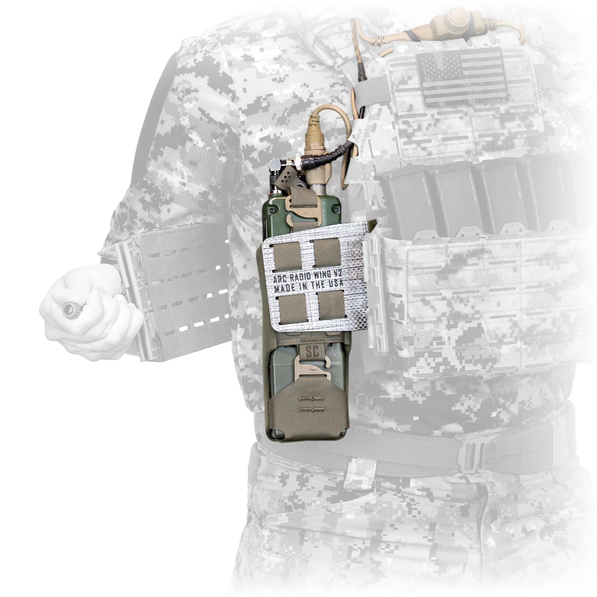 The ARC Radio Wing was inspired by the pain of having the corners of a PRC148 jabbing into our sides for hours on end and thinking there must be a better solution. The ARC Radio Wing V2 is that solution and the further evolution of this idea. The ARC Radio Wing V2 is designed for holding military sized radios such as the PRC163, PRC152, PRC148 and MPU5 as well as any of their side connectors. The radio pouch is meant to be ran underneath a cummerbund in a comfortable and streamlined manner that is also super secure and retained. The pouch mounts to an ambidextrous Tegris® Thermoplastic mount which allows it to be ran on the left or right side of a plate carrier or chest rig that can accept Velcro® side wings. The pouch body is constructed of a stretch nylon fabric and is lined with close cell foam so it can hold the range of radios listed and keep them comfortably against your sides. The bottom features a battery access port of swapping batteries without the need to remove the radio and undo all the comms cables routed through your kit. The top features shockcord retention with a G-Hook to allow the radio to be removed easily during set up or troubleshooting.